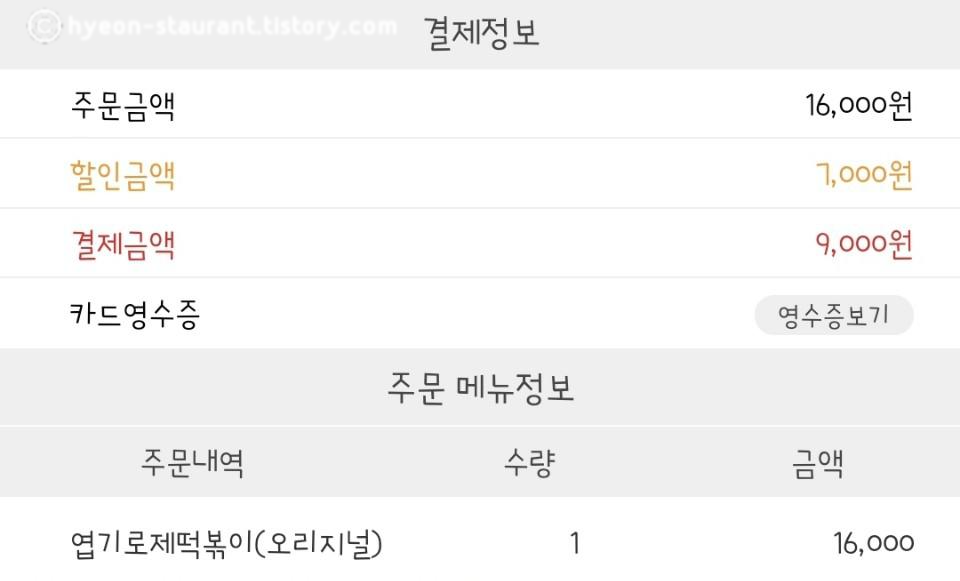 게다가 다행히도(?) 출시 기념 이벤트 중이라 출시기념 할인 + 방문포장까지 최대로 할인을 끌어모아 7000원을 할인받고 9000원에 엽떡로제떡볶이를 구매할 수 있었습니다.
